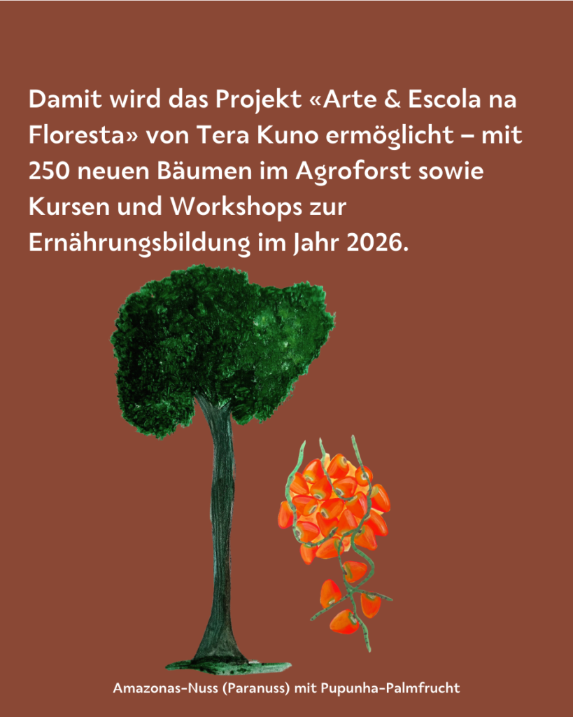 Diese ersten Bäume pflanzen wir im März 2025 im Agroforst-Modell. Dazu zählen Fruchtbäume wie Kakao, Kaffee, Jatoba, Cumaru, Jaca oder Ingá.